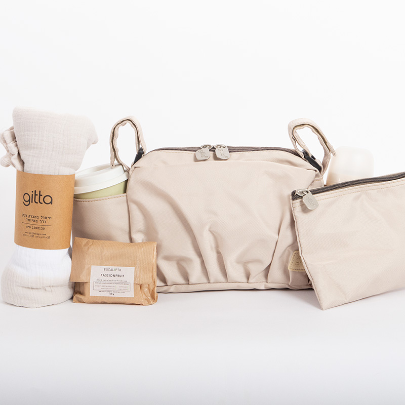 נרתיק לבקבוק- עם חומר מבודד ששומר על חום/ קור, נרתיק למוצץ- עם לשונית לתפיסה לתיק/ עגלה נסגרת בלחצנית, רשת כביסה לבגדים מלוכלכים/ נקיים