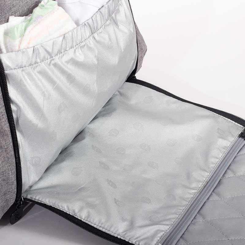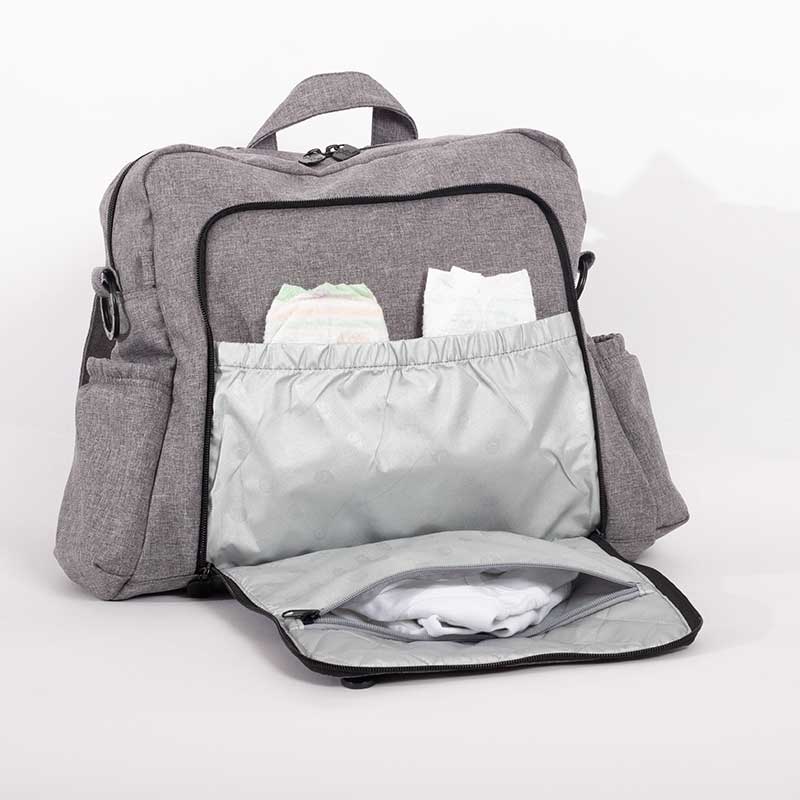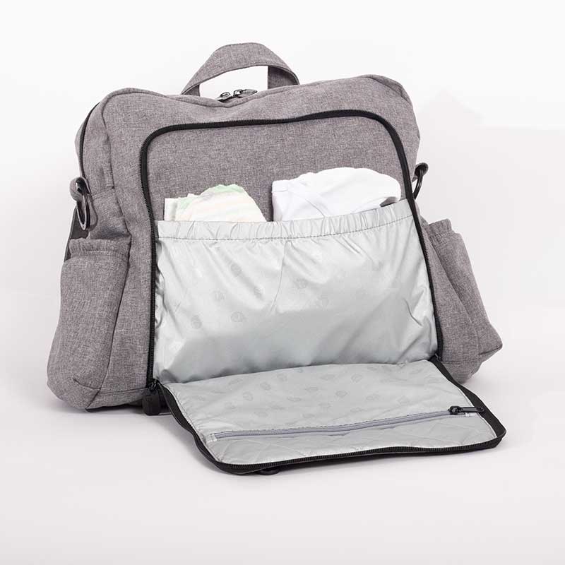 - Changing compartment at the back for fast, convenient diaper changing, even when the bag is full. Comes with an easily-detachable, lightweight, liquid-repellent, padded changing mat.